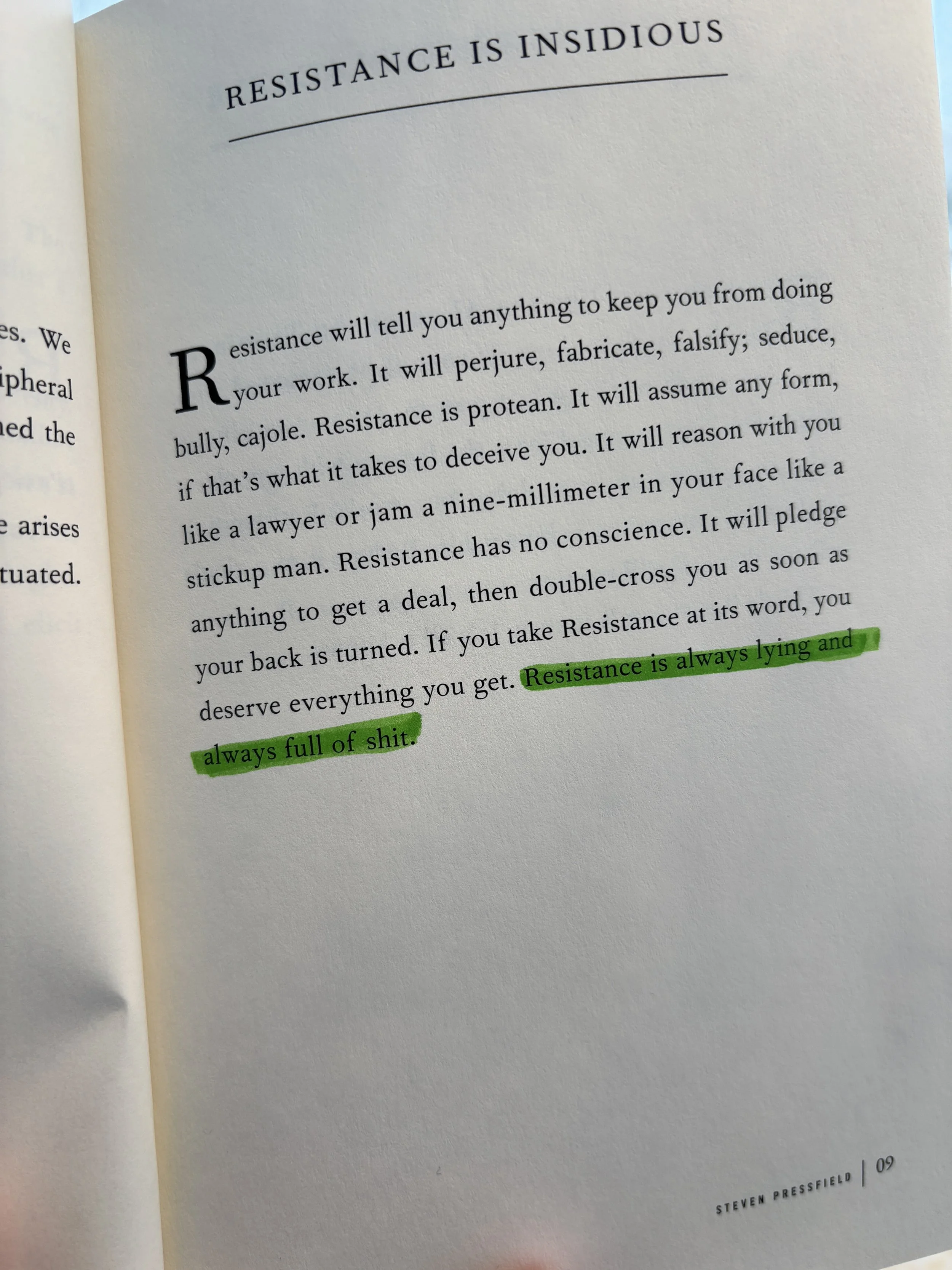 On that retreat last January, I took along Steven Pressfield’s book The War of Art: Break Through Your Blocks and Win Your Creative Inner Battles which is ironic considering everything I’ve just shared. And what is even more ironic is the passage I highlighted for myself 13 months ago that I found among my retreat photos today. I’ll post it below. I can’t even…