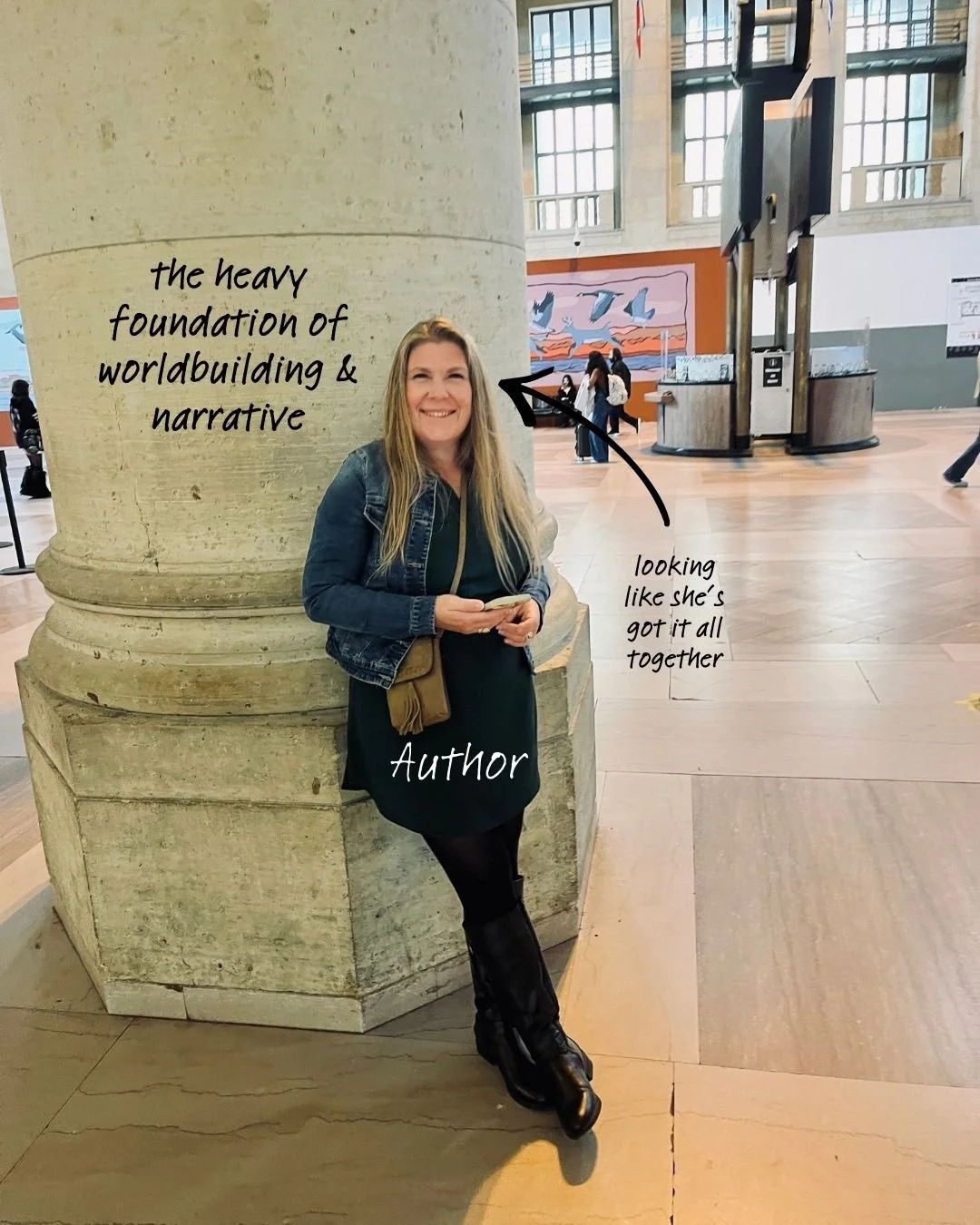 A few days ago I made an Instagram carousel. It contained photos my husband took of me, leaning against a pillar at Union Station in Toronto, with my phone in hand: basically me watching him approaching me as I was figuring out the directions to Little Canada and he was returning from the washroom. But I repurposed it (as all wise artists do) to tell a story about the author’s life. The pillar? That's all the worldbuilding and character development we authors carry around. Me? I'm the author, shouldering all of it. The phone? Ideas. Those beautiful, terrible, lightning-strike thoughts that either save us or send us spiraling.