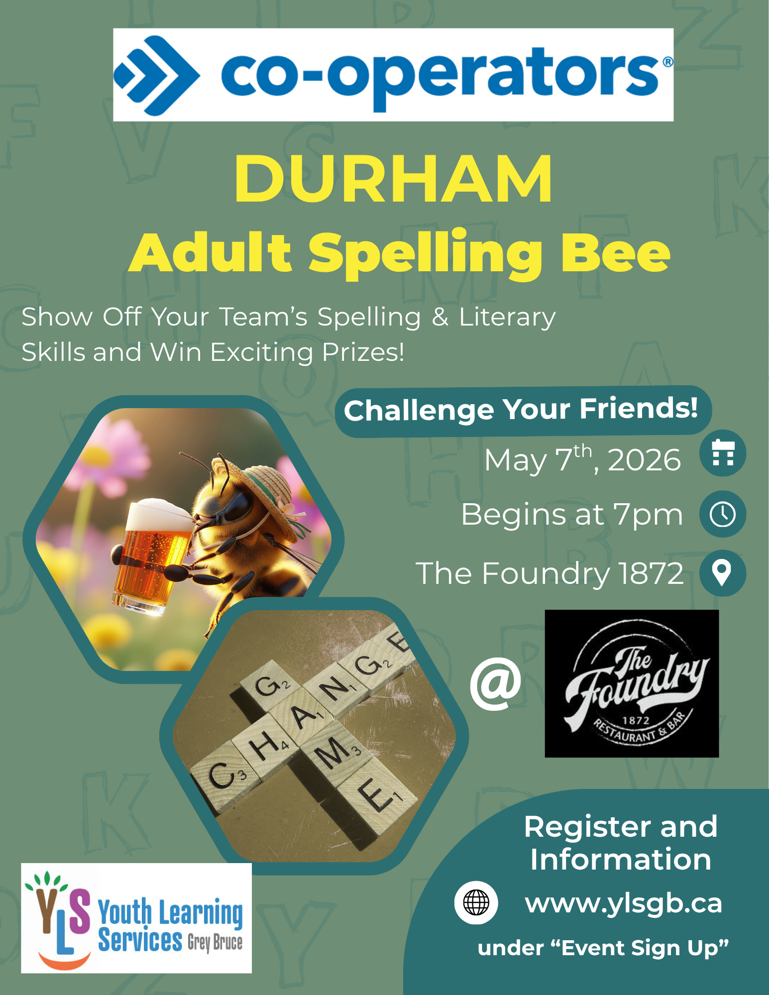 JUDGE: Adult Spelling Bee Thursday, May 7, 2026 7:00 p.m. 9:00 p.m. The Foundry 1872 204 Garafraxa Street South Durham, ON, N0G 1R0 Canada (map) Google Calendar ICS Register Your Team! Register Your Team! SUPPORT YOUTH LITERACY! Sign up and I’ll help to determine if you get to take home the trophy!